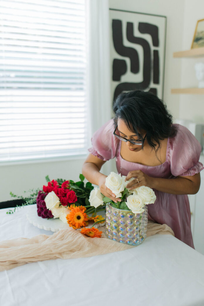Stick to flowers that are in season and easy to find, like roses, tulips, daisies, or sunflowers. Not only are they more affordable, but they also tend to last longer and look fresher. You can even pick up a budget-friendly bouquet from your local grocery store and transform it into something special. My favorite place to grab flowers is Trader Joe’s. If I’m needing flowers in bulk, I love to shop at Sam’s Club or a wholesale flower shop in my area. I try to stick to a budget when flower arranging because it can get expensive.