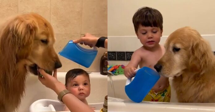 The first half of the video shows the early days, where mom sits beside the tub, washing both the dog and her baby at the same time. Hudson stays perfectly still, just letting it all happen. The vibes in the video are calm and sweet, and very much the picture of a Golden Retriever who learned early on to share bathtime with a toddler.
