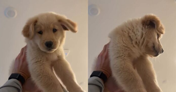 Winnie, a fluffy Golden Retriever puppy, is quickly learning the boundaries of puppyhood. The short clip, shared on Instagram, begins with the text, “When dad puts me in air jail for biting him.” The video shows the pup lifted into the air, with her little paws dangling as her dad holds her at arm’s length. Her floppy ears bounce while she wiggles, visibly unsure what to make of her “punishment.”
