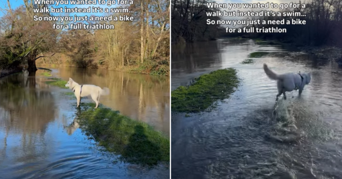 In the video, the dog walks like it’s any other day, except the “path” looks more like a shallow river, and his walk is essentially a swim. Flooding has covered much of the walking route, turning the usual stroll into a splashy adventure. However, Kyoshi looks completely delighted about it. In the caption, the owner explains, “There’s been floods in Surrey,” and the dog seems to enjoy the aftermath.