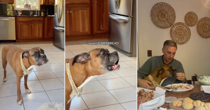 A Boxer named Poppy turns a family table moment into a tiny royal standoff. The dog clip stars a pearl-draped Boxer who refuses to accept “no.” Filmed at home by her owner, Vanessa Nelson, the reel shows how her grandpa is trying to hold the line on treats. Poppy answers with dramatic “speech,” wide eyes, and persistent barks. It’s playful, affectionate, and perfectly timed to caption jokes. By the end, the mood softens, and the dinner table becomes a truce zone.