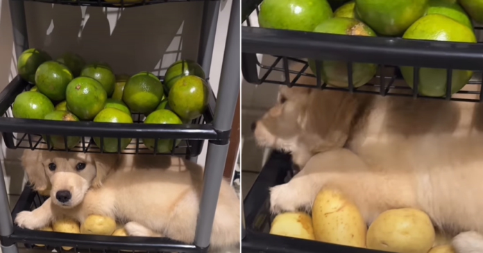 Take a look at this golden retriever puppy who turned a kitchen fruit basket into his nap spot: