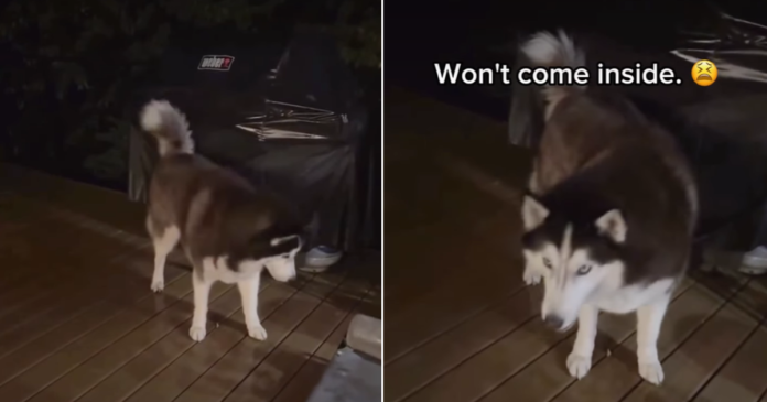 Quarter to four in the morning is prime deep sleep time for most people, but Archer operates on his own clock. On the @siberianderpskies Instagram page, this black and white Husky is seen standing in the pouring rain on a dark patio. He refuses to come inside, forcing his exhausted dad to investigate the 3:45 AM commotion. While his sister Leia was likely cozy inside, Archer stayed out to bark up a storm. He decided he needed a specific toy to sleep and that simply could not wait until sunrise.