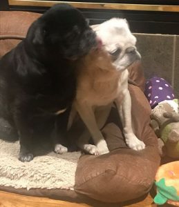Hello! We’re LuLu and Blackjack, 12 and 11 years old. We’ve known each other for almost our whole lives and love each other very much. Don’t let our ages fool you. In spite of having some senior arthritis, we have a lot of energy for senior pugs. jumping and running around. However, we also both love to cuddle while watching TV and to snuggle in bed. LuLu is very attached to women and will follow them throughout the house.