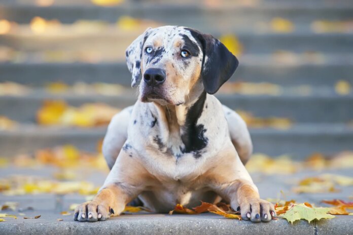 Merle coats and striking eyes: Their coats often include marbled patches, and many Catahoulas have blue or heterochromatic (two-colored) eyes.