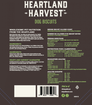 The Heartland Harvest Dog Biscuits – Meaty Flavor with Chicken product comes in a 4-pound bag, with UPC: 840227340691, marked with lot #40906513 on the back and with a best by expiration date of 09/06/2026 stamped on the back.