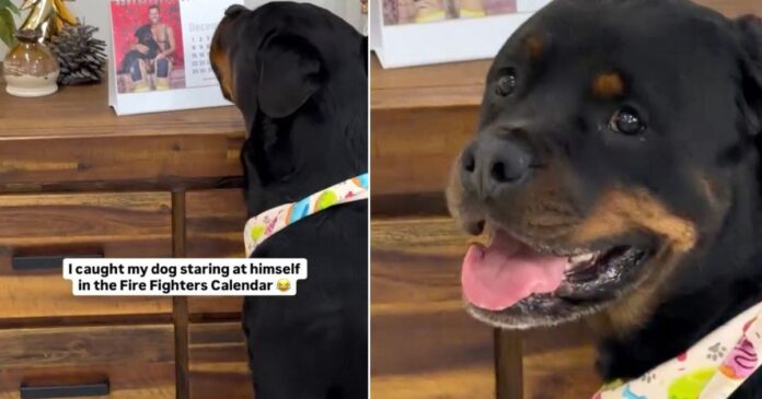 The clip plays like a mini skit. He sits square in front of the calendar, ears perked. The camera zooms in on Mr. December 2025 posing with Beau. Cut back to the dog, whose mouth opens into an unmistakable grin. He turns, flashes a smile at his human, and resumes admiring the Rottweiler photo as the music grooves.