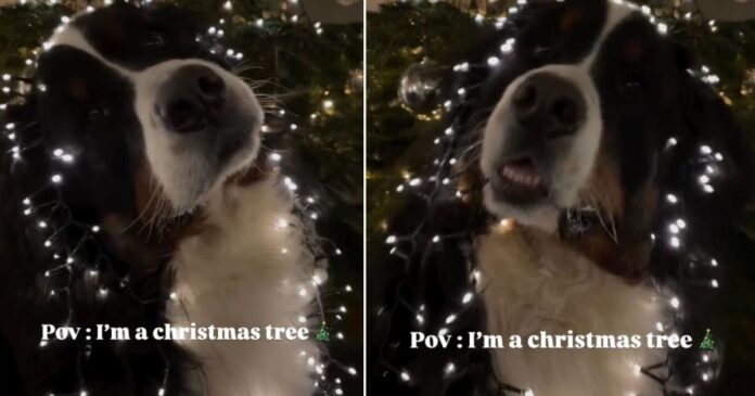 The video’s on-caption reads, “Pov: I’m a christmas tree,” which fits perfectly with the scene. The Christmas decorations and the soft lights glow against the Bernese Mountain Dog’s dark fur while he just looks at the camera, steady and patient. His owner added the caption, “Almost ready for Christmas,” and that’s pretty much what he looks like — ready, but maybe still wondering why he is glowing.