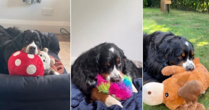 Bernese Mountain Dog loves her stuffed toys for emotional support in cute video