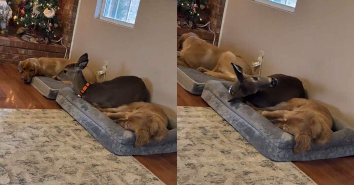 An absolutely adorable clip is going viral among animal lovers. In the video, a deer has chosen the safest and warmest place in the world to sleep, which just so happens to be right between two Golden Retrievers.
