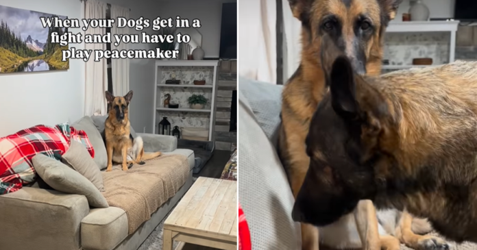This video captures two German Shepherds dealing with the aftermath of an alleged fight. It is clear as day that they are not speaking to each other. Absolutely cannot stand the sight of the other, in fact. And then the video shows dad trying to act as the mediator in this awkward dog fight.