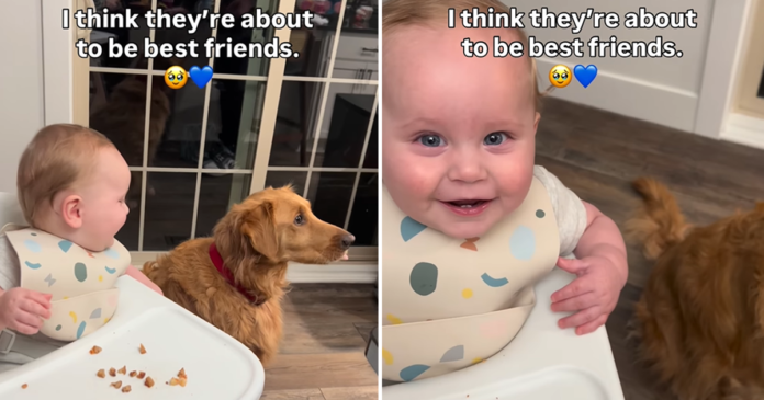 The video’s on-screen caption anticipates a long bond between the Golden Retriever and the baby, saying what everyone is thinking: “I think they’re about to be best friends.” In the video, Ace stays close to Beau’s chair, sitting politely and then popping up to snag another treat. Beau, at the same time, looks completely locked in as if he is watching the greatest comedy special of his life — and for Beau, he certainly is.