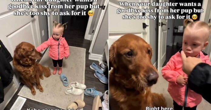 A simple request turns into a moment of pure joy. This viral video shows just how special the bond between children and dogs can be. In the clip, a Golden Retriever named Kobe gently leans in to kiss a little girl’s cheek, instantly sending her into a fit of giggles and smiles. The sweet interaction has resonated with viewers across social media, who can’t get enough of the pair’s growing friendship.