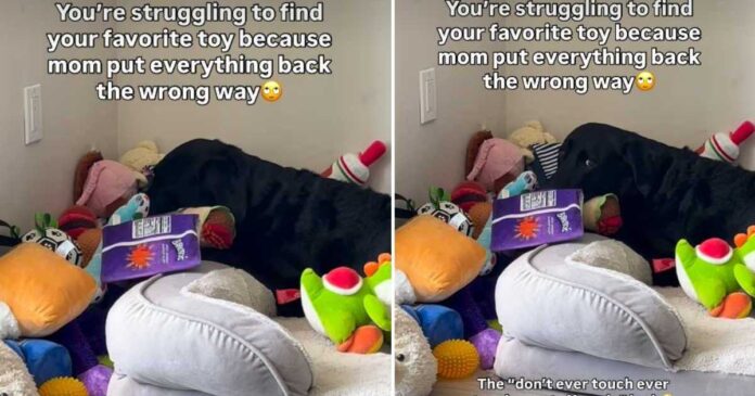 The clip opens with the Labrador standing over a neatly stacked pile of toys, clearly on a mission to retrieve a specific favorite. However, something feels off. As the text overlay reads, “You’re struggling to find your favorite toy because mom put everything back the same way,” the dog begins sniffing, pausing, and staring at the pile with visible confusion.