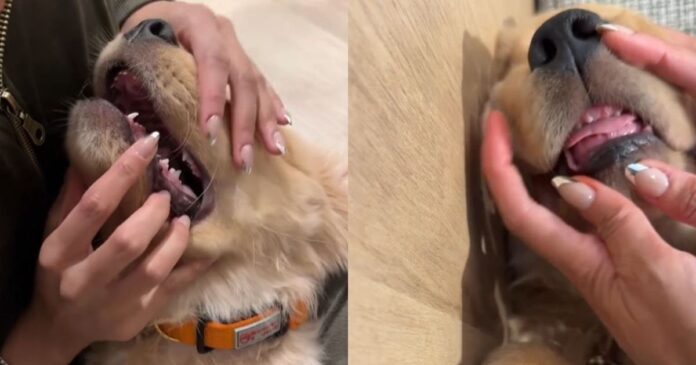 Golden Retrievers are naturally mouthy, especially when exploring the world as a puppy. His tiny grin looks more like a row of needles than actual molars. One viewer observed that this in-between phase is the best. Chief stays relaxed while his mom inspects the progress.