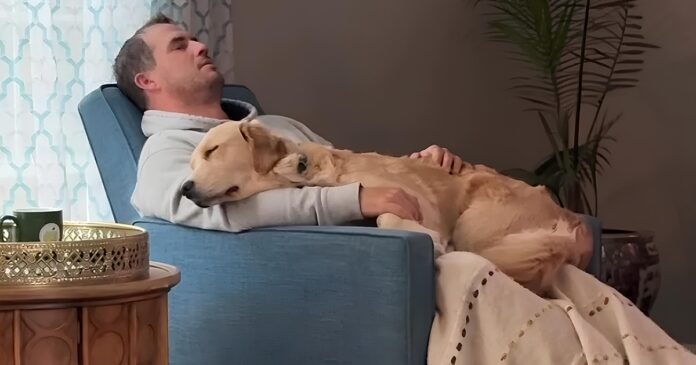 Video shows Golden Retrievers snuggling with and beside dad